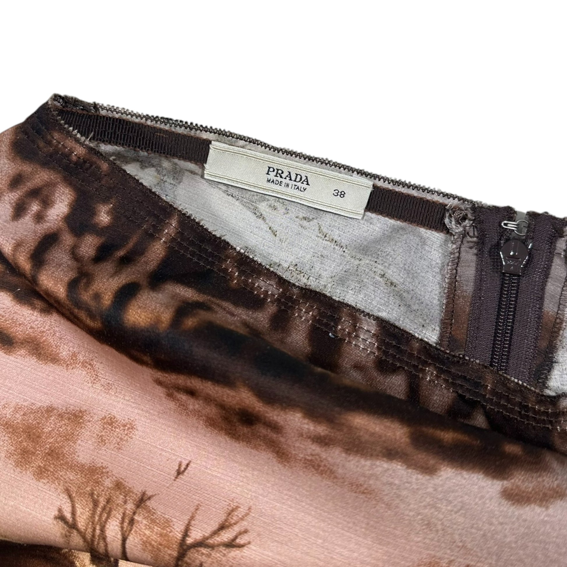 Wool and silk blend skirt from Prada’s Fall/Winter 2004 collection, printed with the season’s signature ruins landscape motif. The design draws from 19th-century German Romantic painter Caspar David Friedrich, whose landscapes appeared across jackets, dresses and skirts that season. This variation features a split construction, with the lower section in a different tone and the print cut and repeated to create a distinct two-part design.