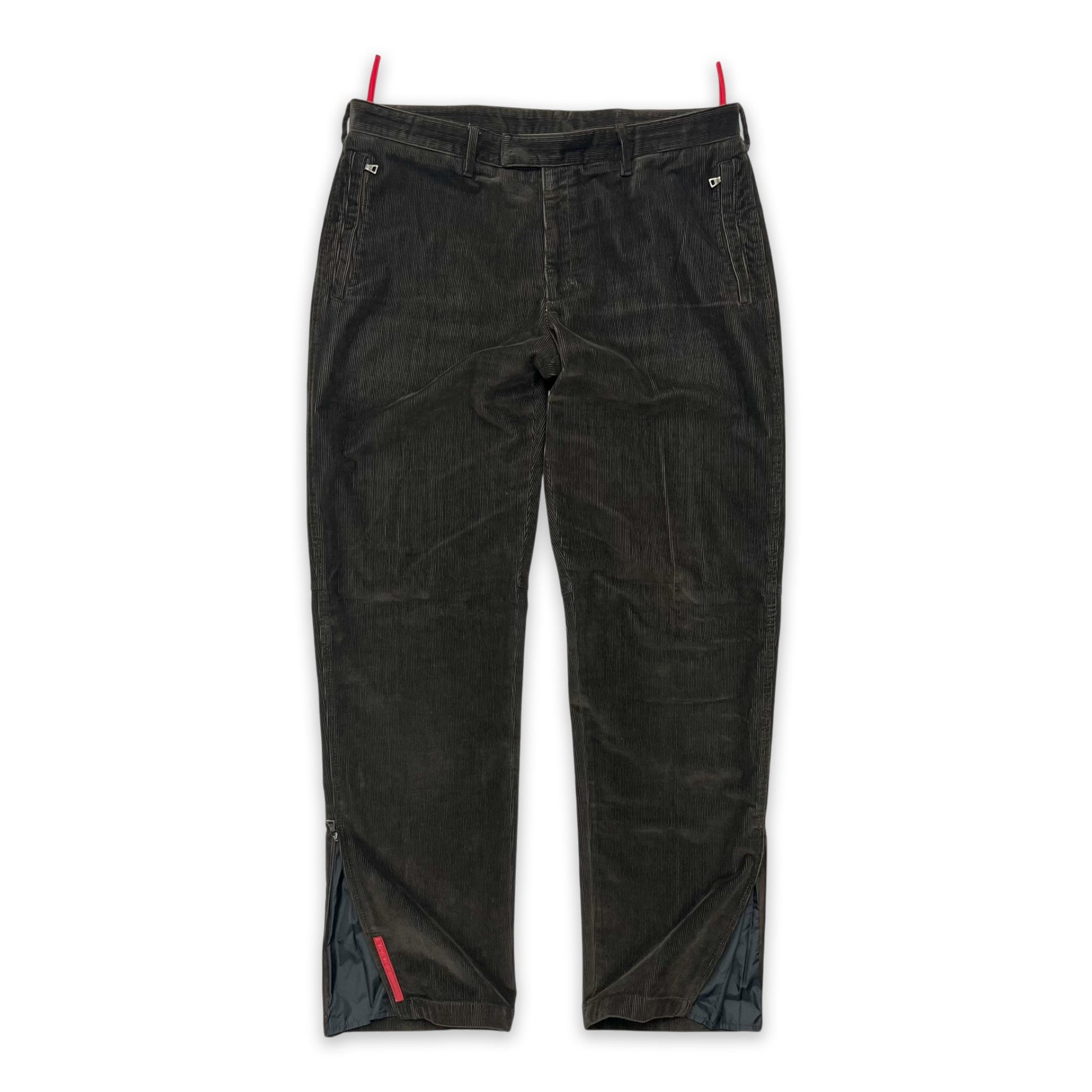 Prada sport corduroy trousers in a brown colour way. Features ankle zips that reveal a nylon lining.