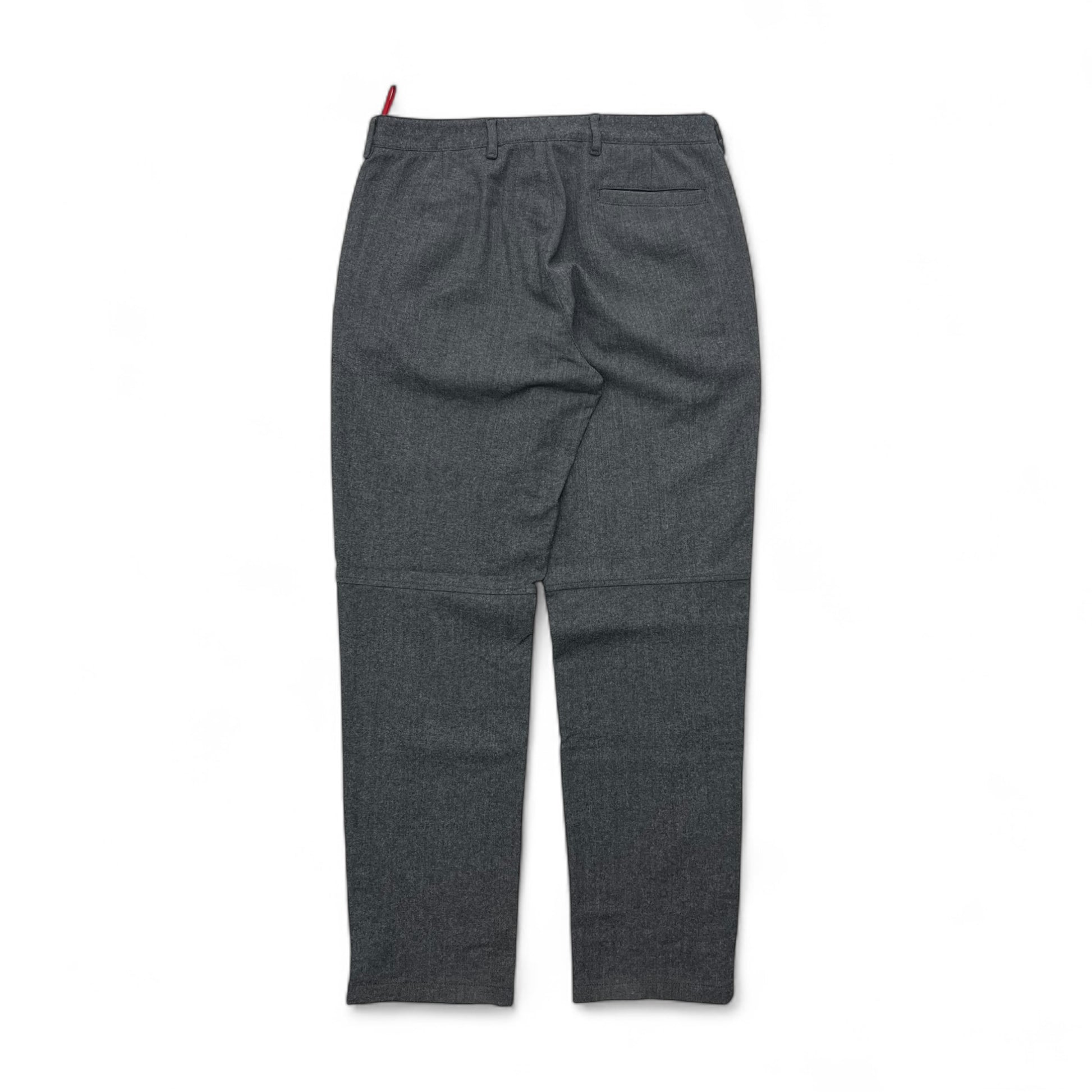 Virgin wool blend grey trousers featuring front zip pockets and ankle zips that reveal a nylon lining.