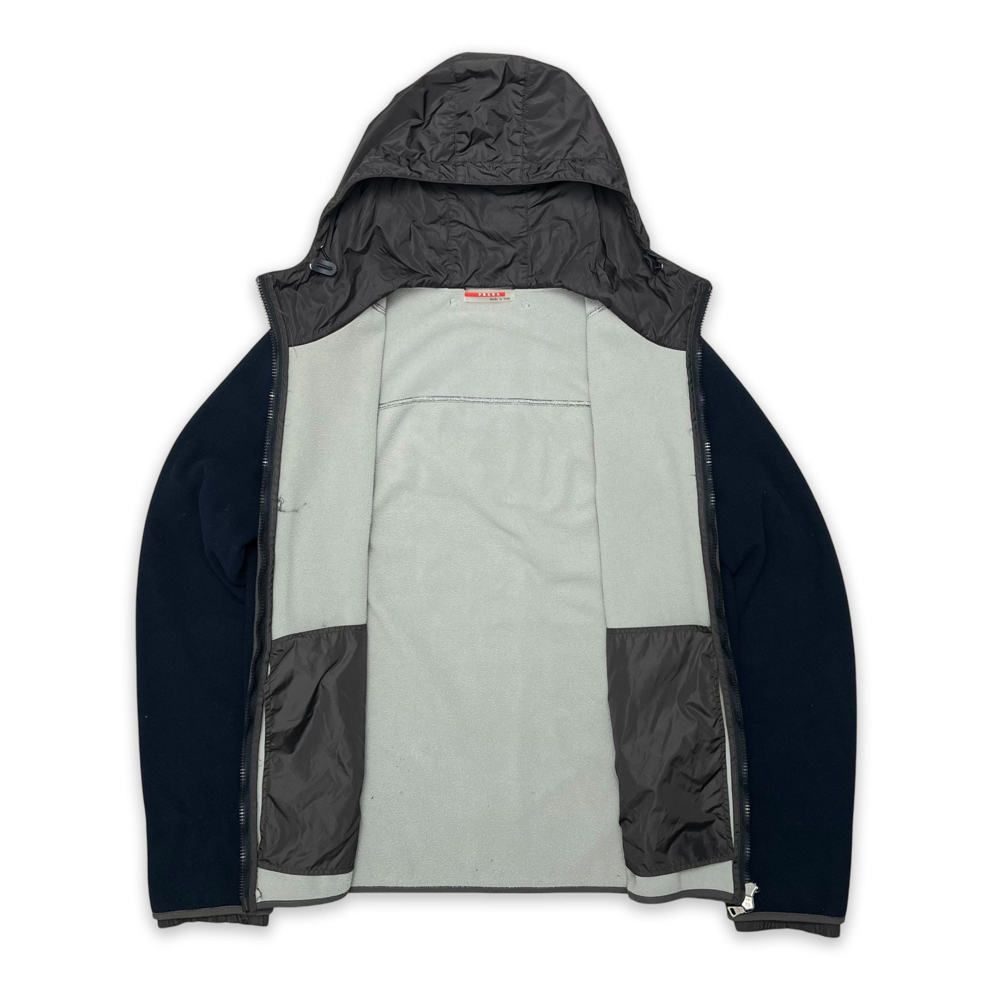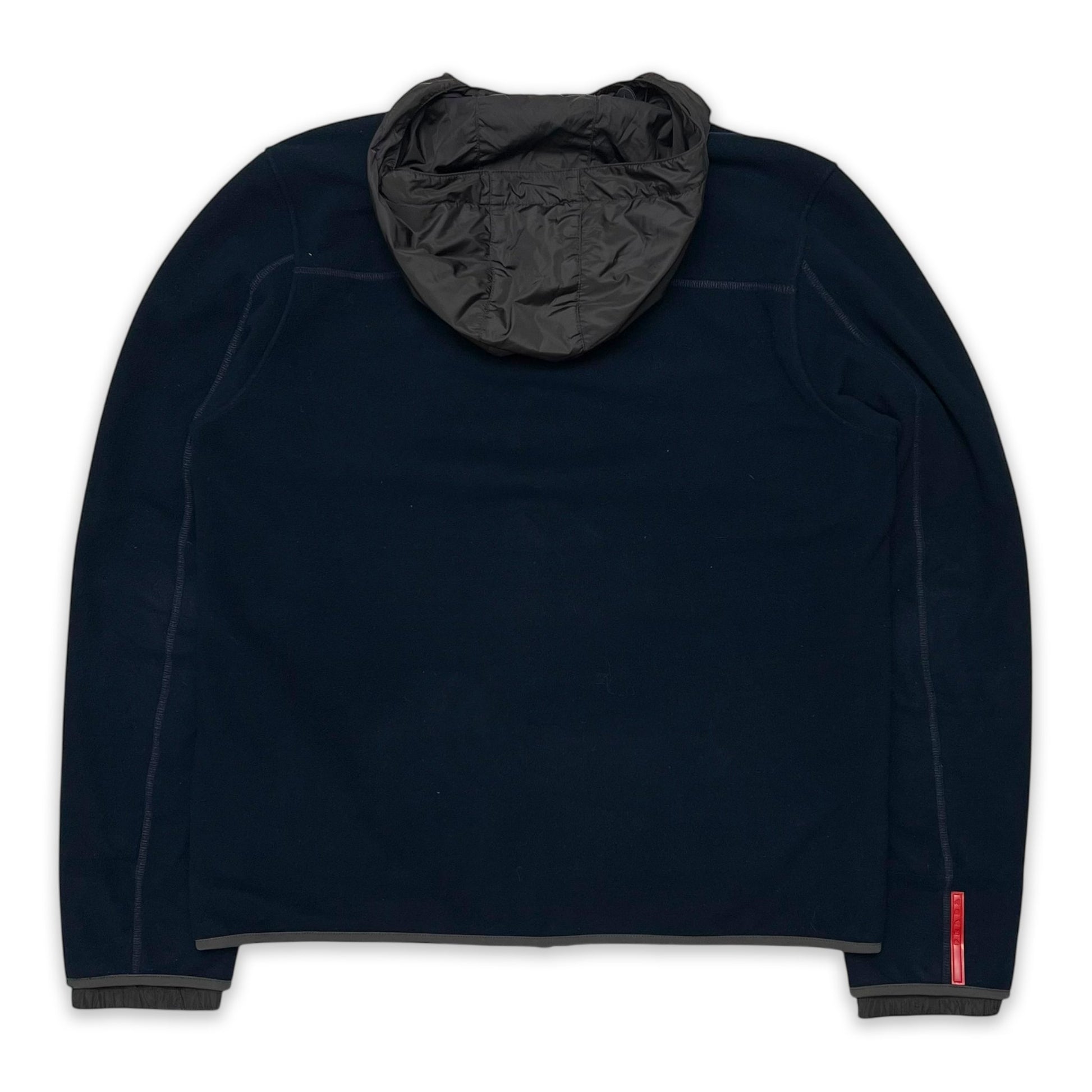 Long-sleeve prada sport fleece in a dark blue colour with contrasting grey nylon adjustable hood. Features dual front zips as well as zipped side pockets.