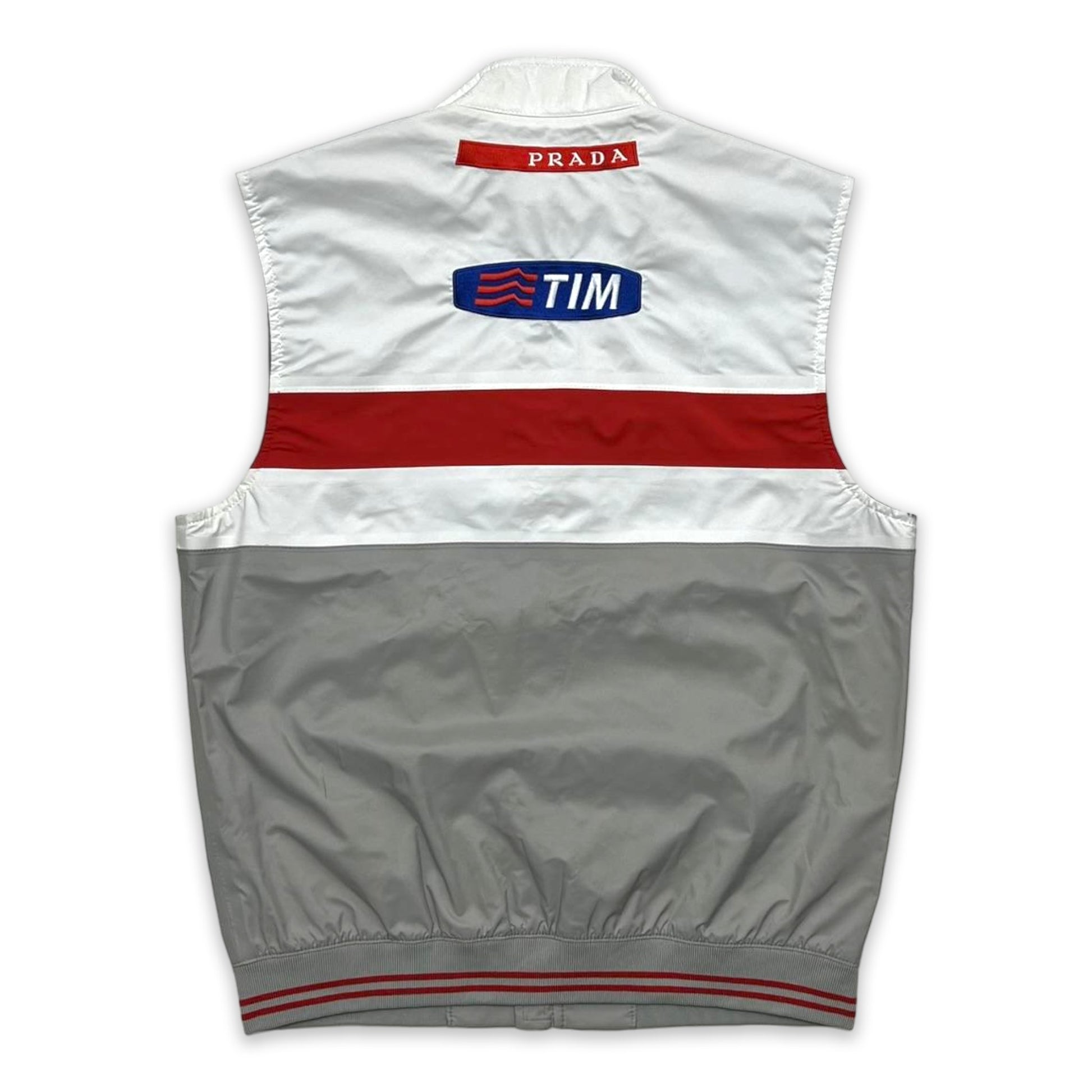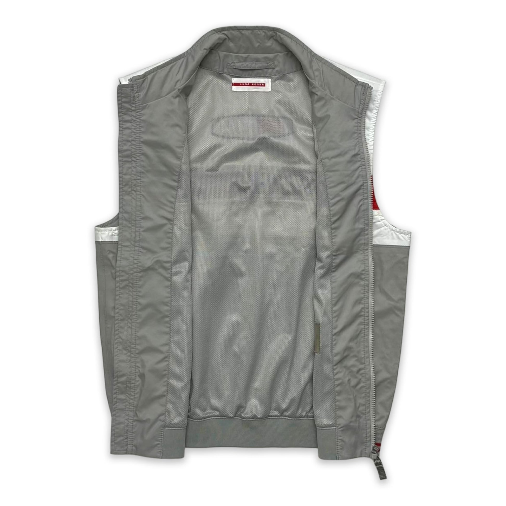 Technical gilet from Prada Sport’s 2003 Luna Rossa Challenge collection, produced for the sailing team’s America’s Cup campaign. Features official sponsor embroidery across the chest, striped ribbed trims, and colour-block nylon panels in white, red, and grey. Finished with a full-zip front and breathable mesh lining