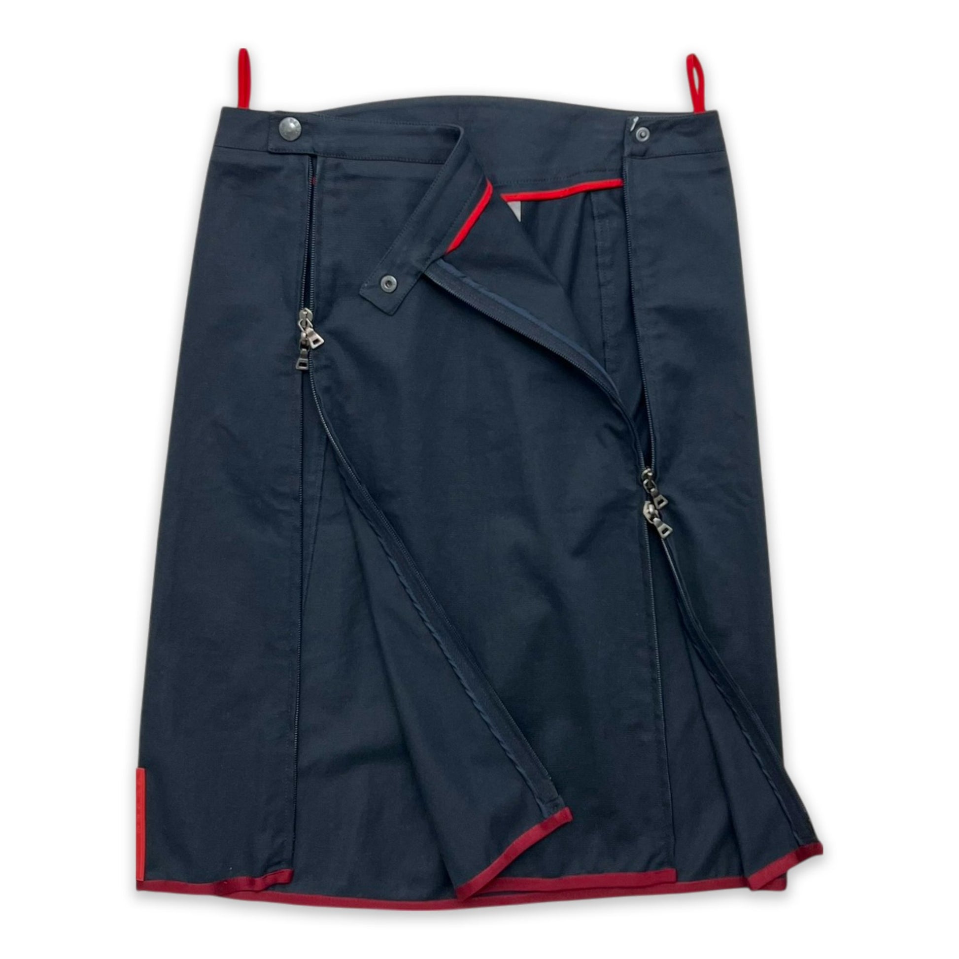 Prada Sport pencil style skirt featuring dual zippers along the front, button fastening along the waist and red trim along the bottom.