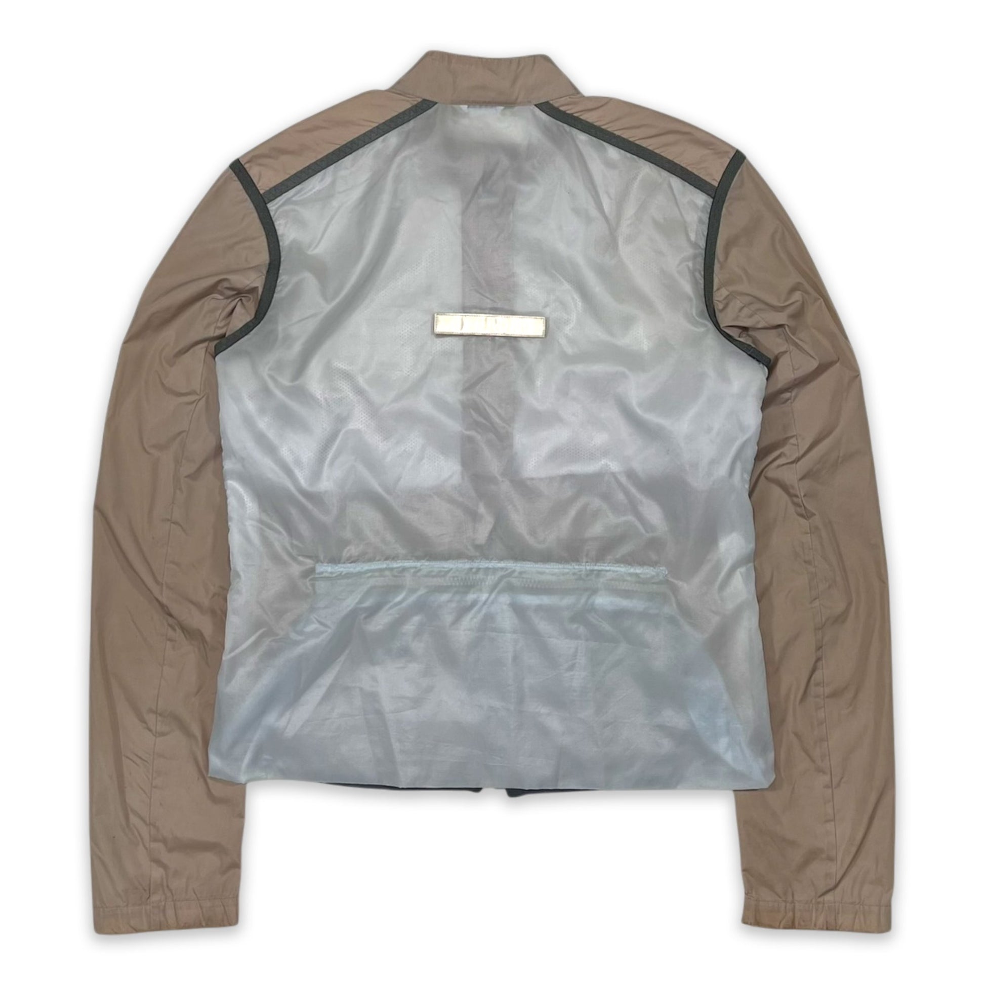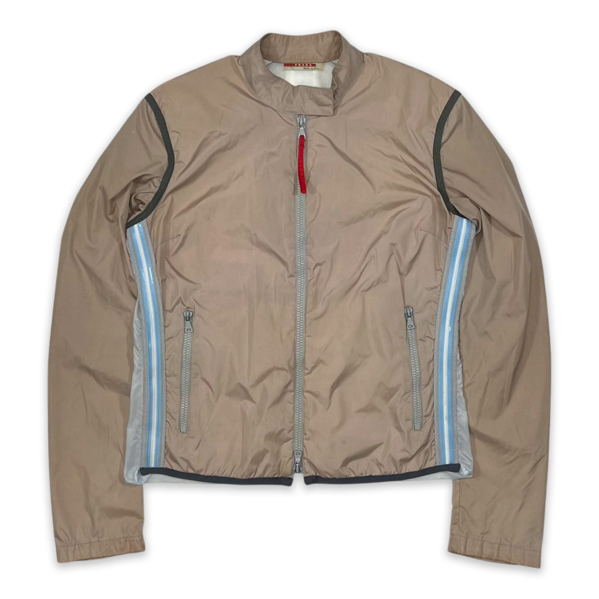 Lightweight tan nylon jacket with iconic gel-seam detailing down the sides, a signature element of Prada Sport’s Spring/Summer 2000 collection. It has a two-way front zip with red pull tab, a snap button closure at the neck, and zip pockets on the front. The back panel extends with a concealed zip and includes a detachable reflective strip secured by velcro.