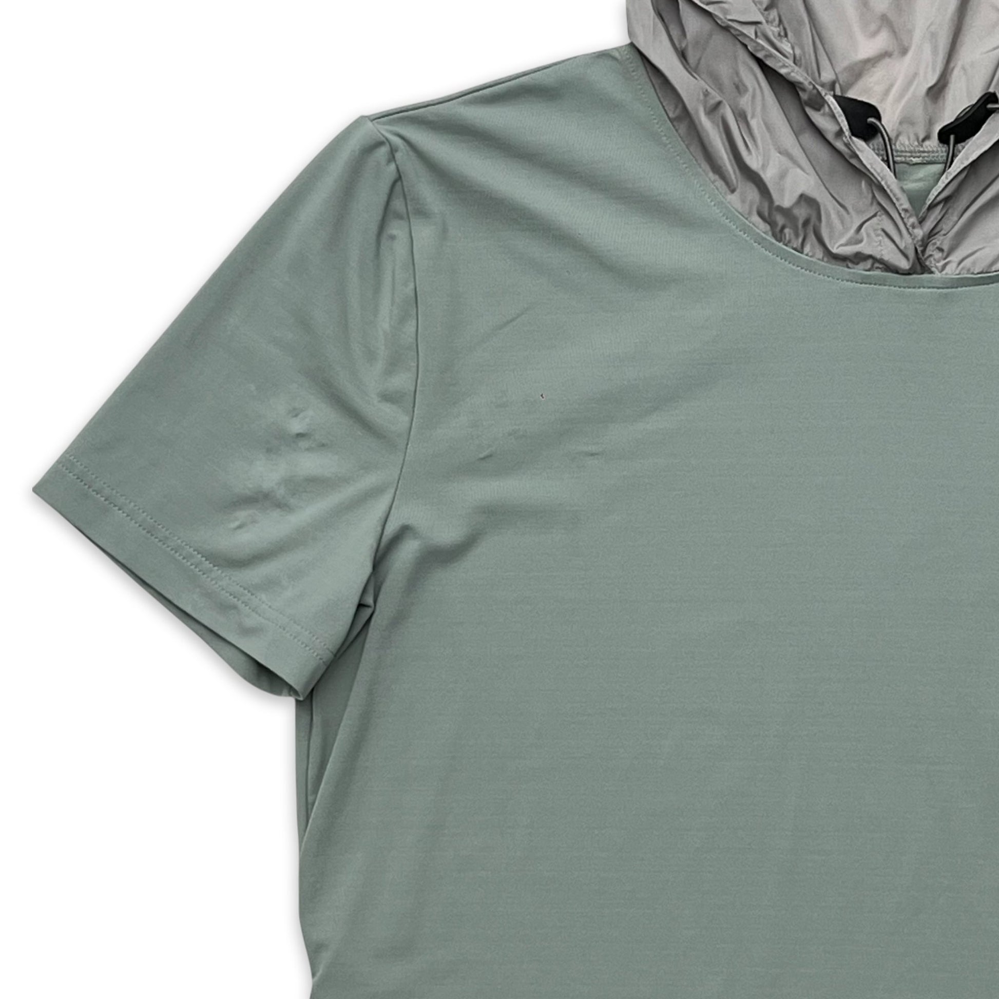 Short-sleeve top in a nylon and elastane stretch blend, detailed with a lightweight nylon hood in grey. The hood features adjustable cords to cinch the fit. Designed in pale green/blue with a small zip pocket at the lower back.