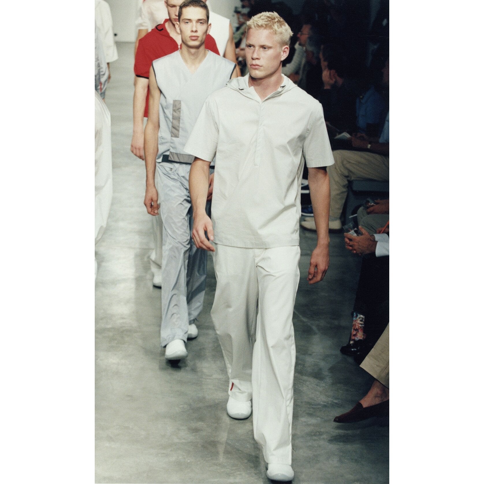 Short-sleeve hooded top in a cotton, nylon and spandex blend with stretch. Designed with an adjustable cord hood for a cinched fit, a half opening with Velcro closure, and a concealed zip running down one side seam. A similar men’s style appeared on the Spring/Summer 1999 runway.