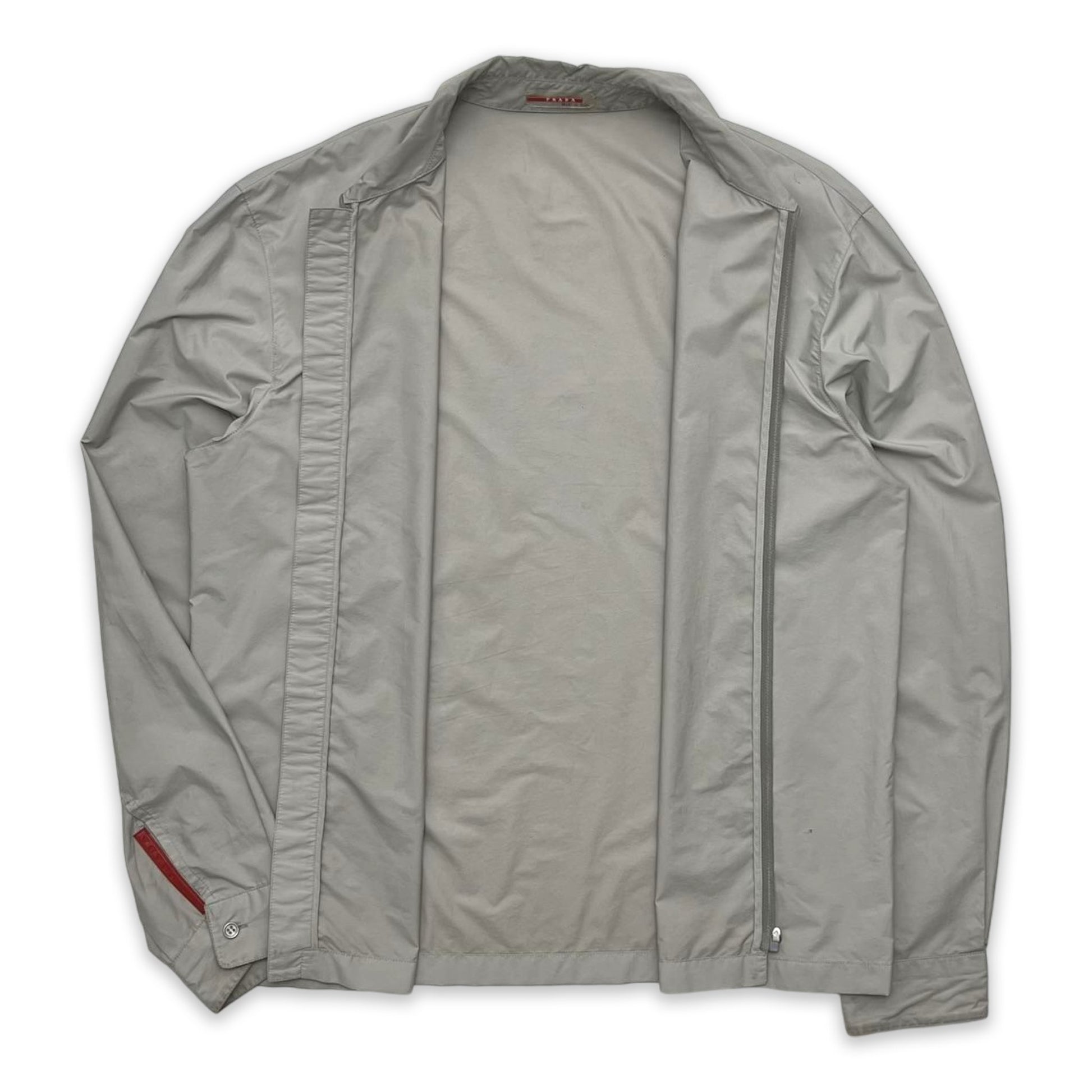 Lightweight jacket in a polyester and nylon blend in grey. From Prada Sport’s Spring/Summer 1999 collection, it has a pointed collar, full front zip closure, and sleeves with buttoned cuffs.