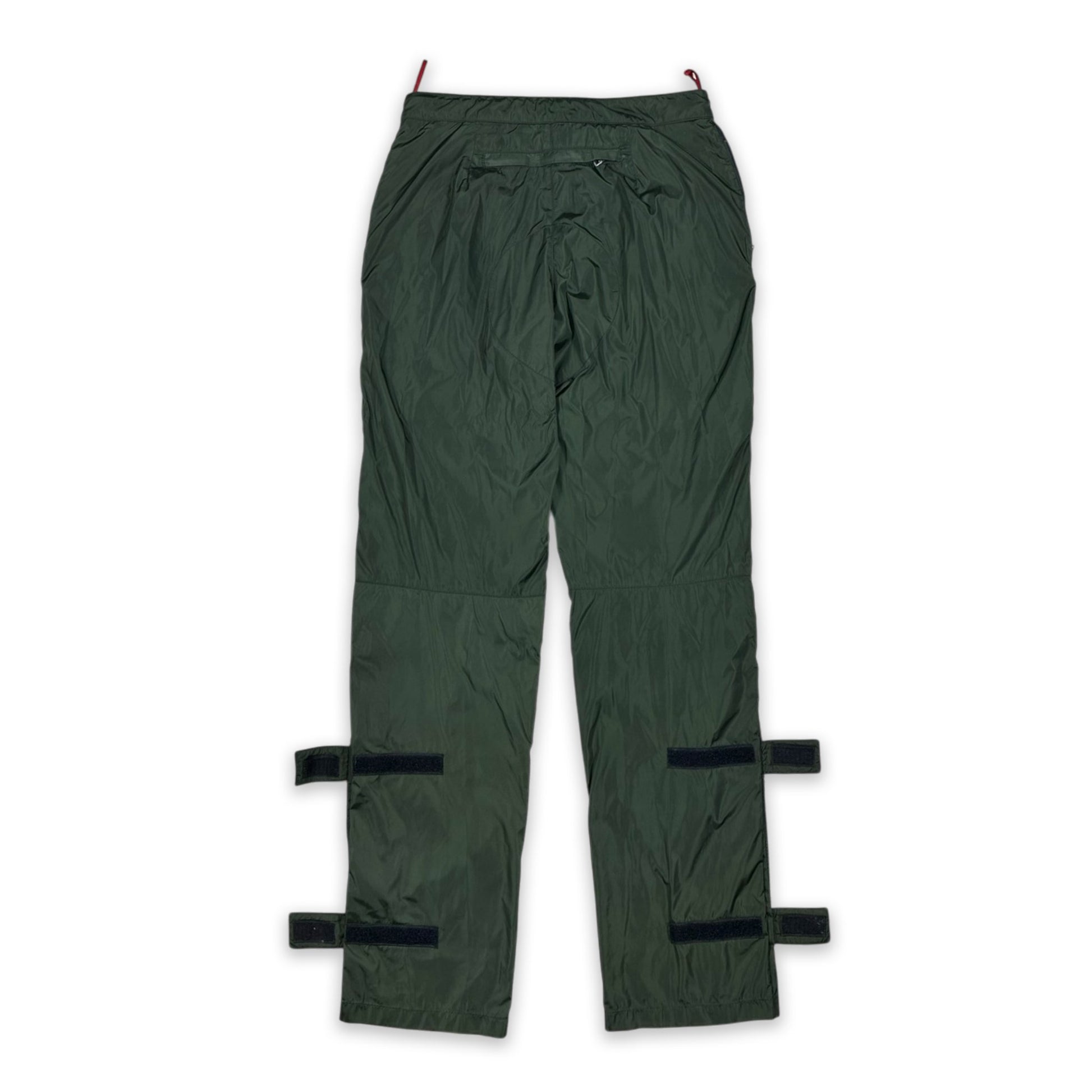 Deep green nylon pants with a snap-button and zip fly, side zip pockets, and a single rear central pocket. Velcro tabs run down the outer leg seams for adjustment, with reflective piping integrated into the outer seams. From Prada Sport’s Fall/Winter 1999 collection.